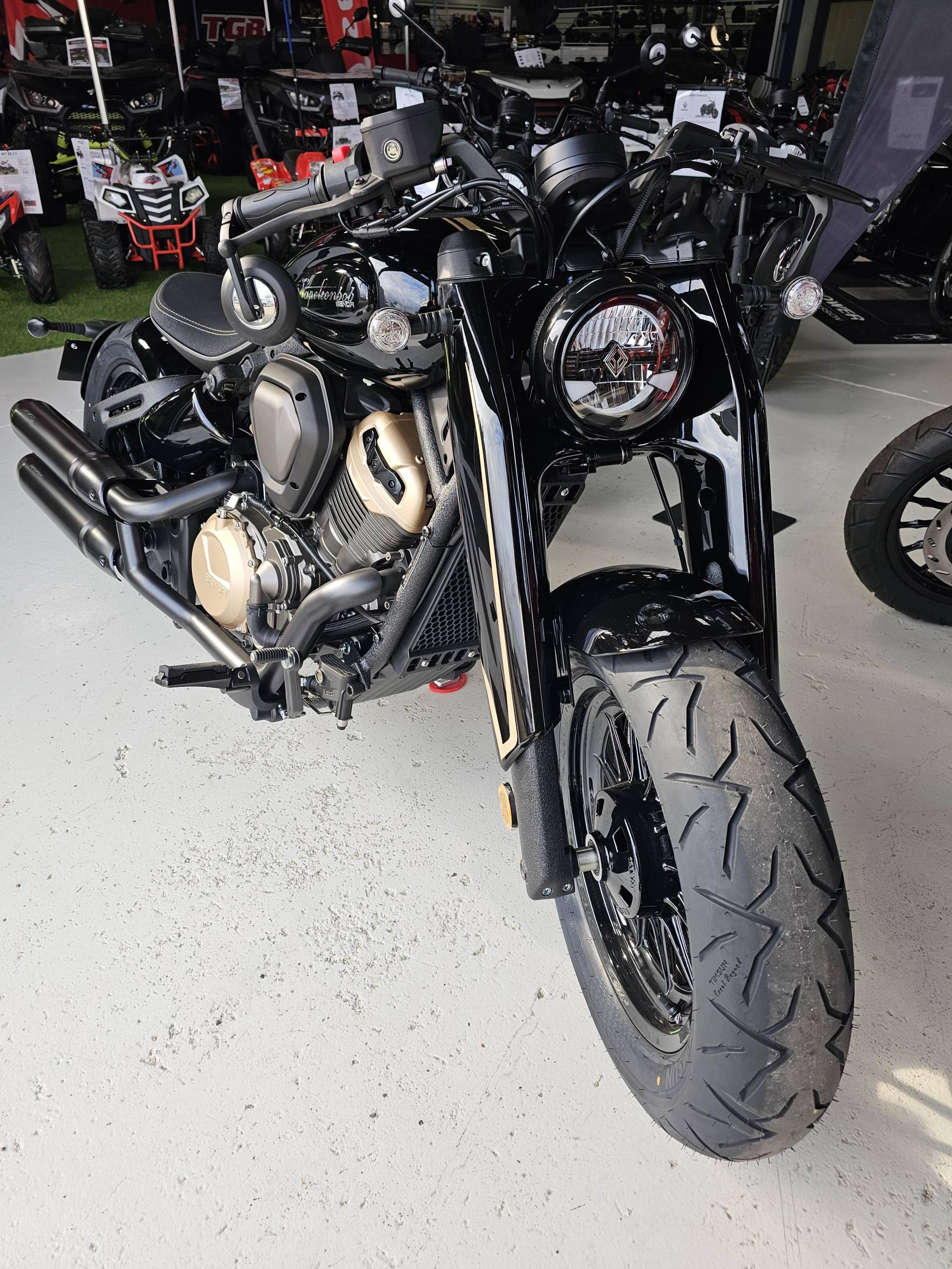 Le Bobber par excellence... Avec la NAPOLEON vous savourerez pleinement vos balades en solo, elle vous surprendra avec sa puissance et son couple délivré par son incroyable moteur bicylindres en V! Un custom de caractère qui a su allier l’élégance et l’originalité. Animée par un V2 et une boîte à 6 vitesses, la NAPOLEON répondra à toutes vos attentes. Vous la cherchiez depuis longtemps, elle est là, elle vous attend! La NAPOLEON 500 était très attendue et elle fait déjà beaucoup parler d'elle, une moto avec un look unique et exceptionnel qui sort vraiment des sentiers battus!