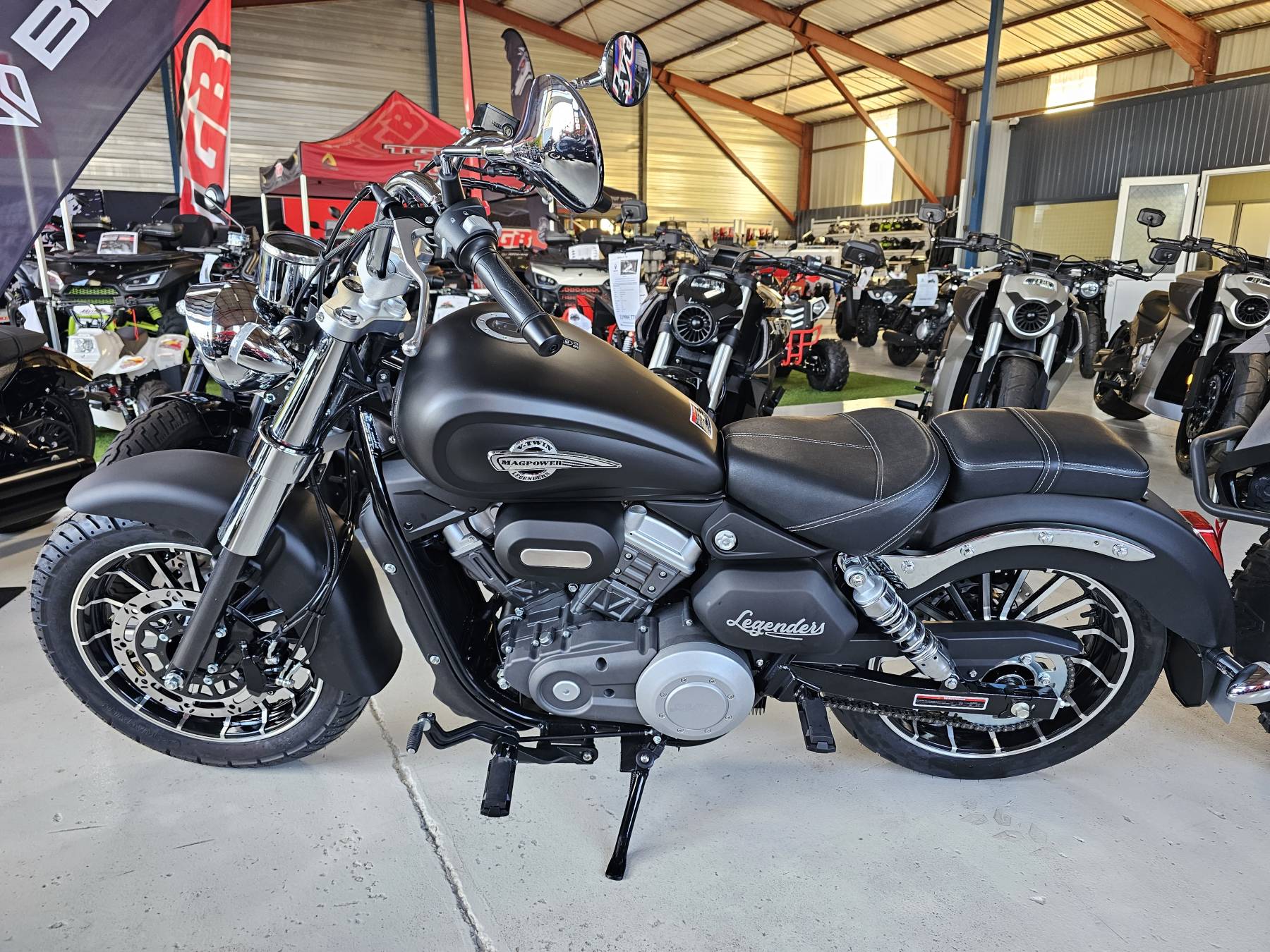 Avec la Legenders, Magpower revisite le custom. Animée par un moteur bicylindre en V à injection électronique, la Legenders vous invitera à de longues balades, sans concession, grâce à une excellente position de conduite et à son assise très confortable, tant pour le pilote que pour le passager. La sécurité n'en n'est pas pour autant oubliée. Équipée d'un double frein à disque avant et du système de freinage simultané (CBS). Vous partirez en toute tranquillité sur les routes avec une réelle sensation de plaisir absolu. Son gabarit imposant et sa sonorité rauque qu'offre son double échappement feront illusions auprès des customs US.