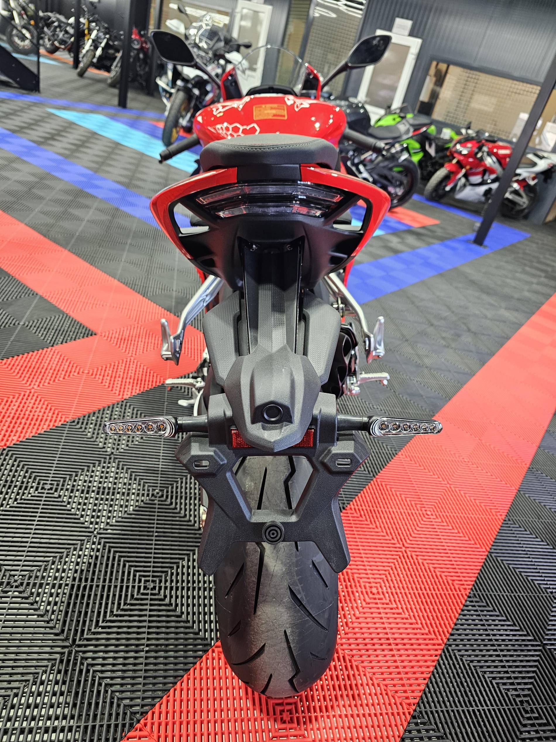 Côté partie-cycle, rien n’est laissé au hasard : fourche inversée et amortisseur Marzocchi réglables, freinage Brembo avec double disque de 320 mm, maître-cylindre radial, pneumatiques Pirelli et équipement full LED.