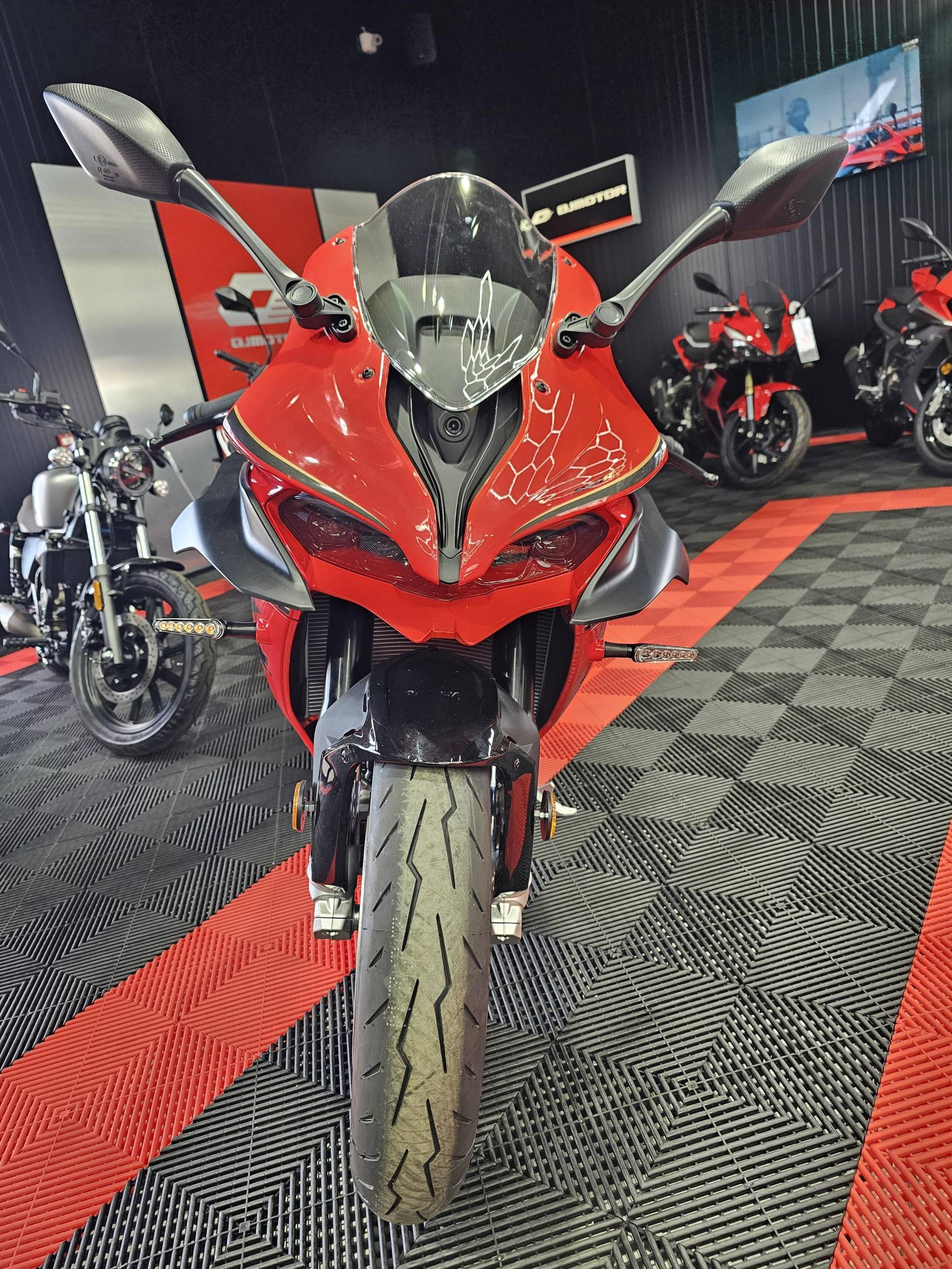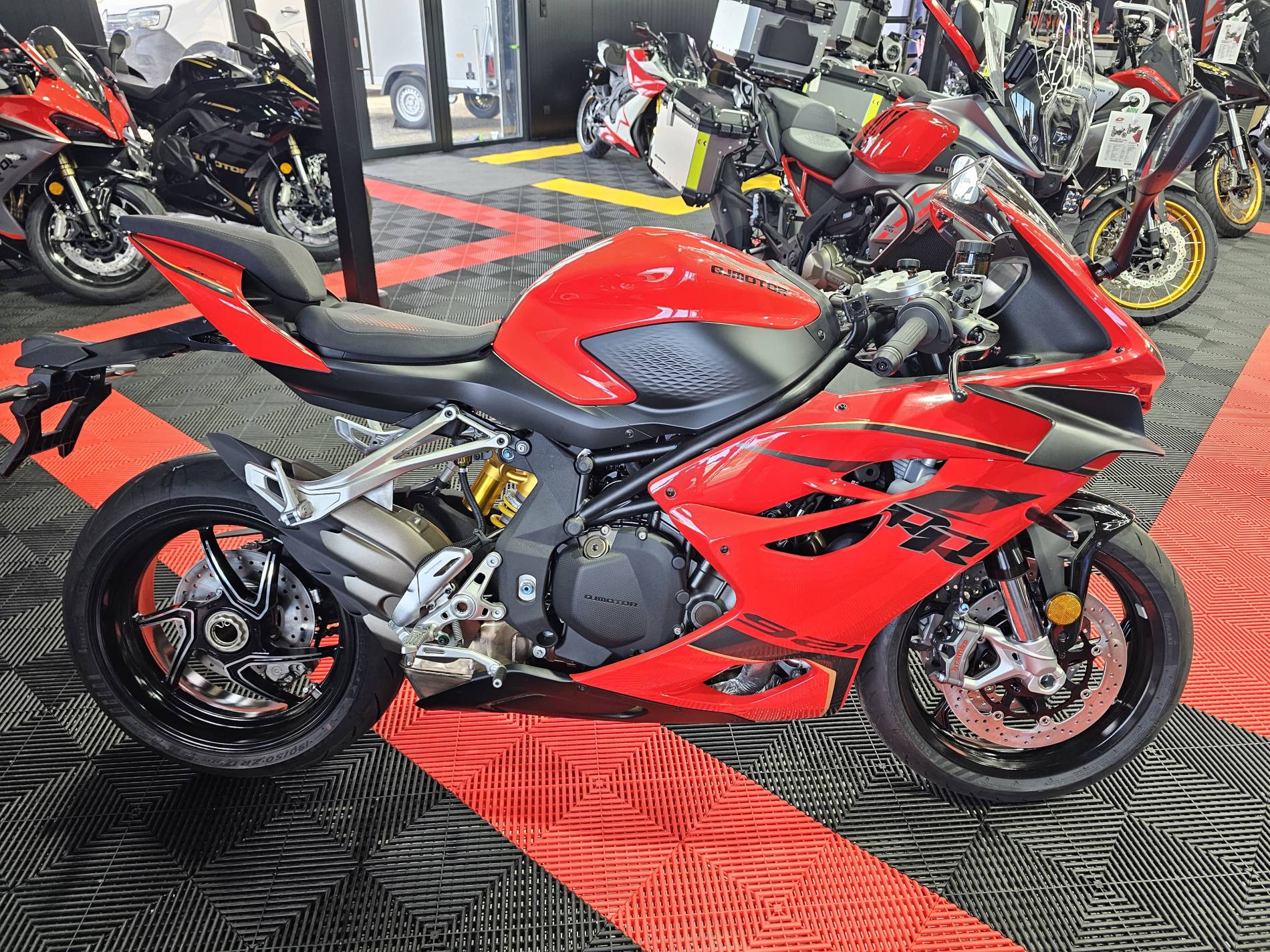 Taillée pour la performance, la SRK 921 RR embarque un 4 cylindres en ligne de 921 cm³, associé aux meilleures technologies du moment : Ride by Wire, Traction Control, régulateur de vitesse et Quickshifter up&down pour des sensations immédiates et un pilotage sans compromis.